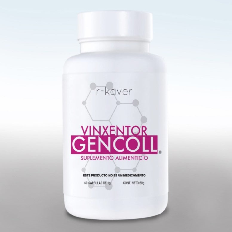 R - kaver "Vinxentor Gencoll", es un suplemento alimenticio que promueve la producción de colágena tanto en la piel como en cartílago, musculo y tendones, “Aporta aminoácidos esenciales que contribuyen a la formación normal de proteínas y antioxidantes naturales de la piel de la manzana que ayudan a proteger las células frente al estrés oxidativo.”